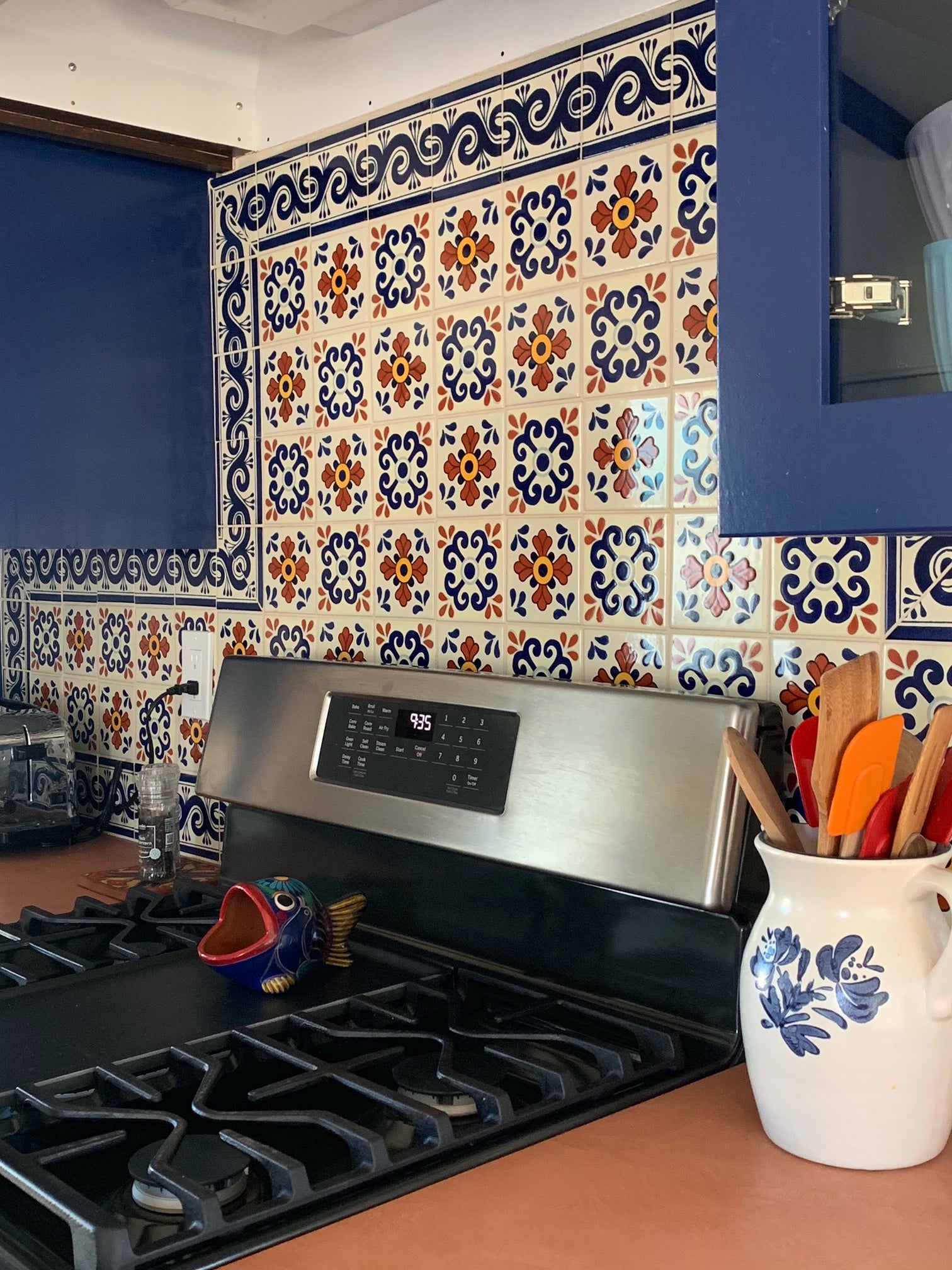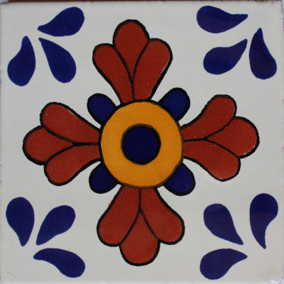 This Mexican tile design is an extremely popular one that has been utilized for centuries. Its simplicity is what makes it so attractive. This tile beautifully complements Saltillo floor pavers. Its earthy colors blend well with a wide range of other home decor accessories. If your project includes colorful decorative Mexican tile, this is an excellent choice. The pattern in this ceramic tile is a set of Mexican white (creamy) background, red flowers with a yellow round center. When four or more are put together a blue flower appears at the center of each corner intersection. Install kitchen photo courtesy of Jackie.Share