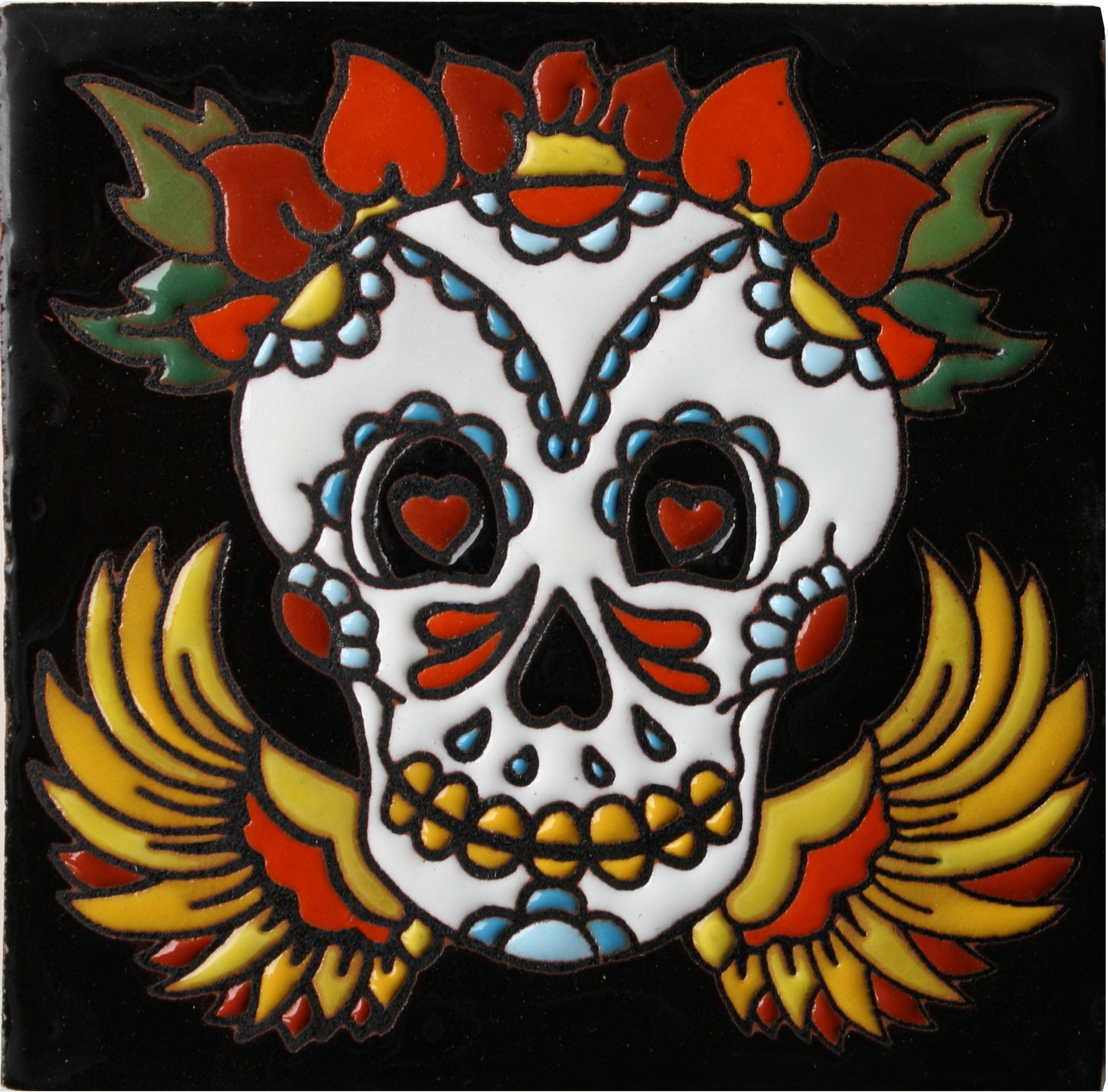 Are you in love? This is a colorful tile celebrating the day of the dead. La Catrina is a Mexican icon created by Jose Guadalupe Posada and embedded into the Mexican culture. Traditionally in the Mexican culture people go to graveyards on the day of the dead (November 2nd), place food and party on the place close to their dead relatives. This is a way to laugh at the death and not take it so seriously, but enjoy life and think about the death as a remote possibility. The tile is raised, meaning the glaze is not completely flat, giving it body to the surface for a highlighted texture.Share