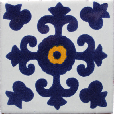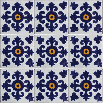 A Talavera tile in a cross-like blue decoration along with blue four-petal flowers at each four-tile intersection. The background is white. Mexican Talavera ceramic is the result of a mixture of cultures over the time. Shop Estancia tiles for traditional Talavera tile. This ceramic tile is just an example of the exquisite beauty the Mexican craftsmen put on each item they create. It is hand-painted, this means that no two tiles are exactly alike! There might be small differences in size, weight and even the paintings. If you want to delight somebody special with an unique handcrafted gift, this is what you are looking for! This tile is special for small patches or entire wall decoration. See our sink website for the matching Valencia Sink. If concerned about the color, we recommend ordering 1 or 2 for examples before ordering a larger quantity.Share